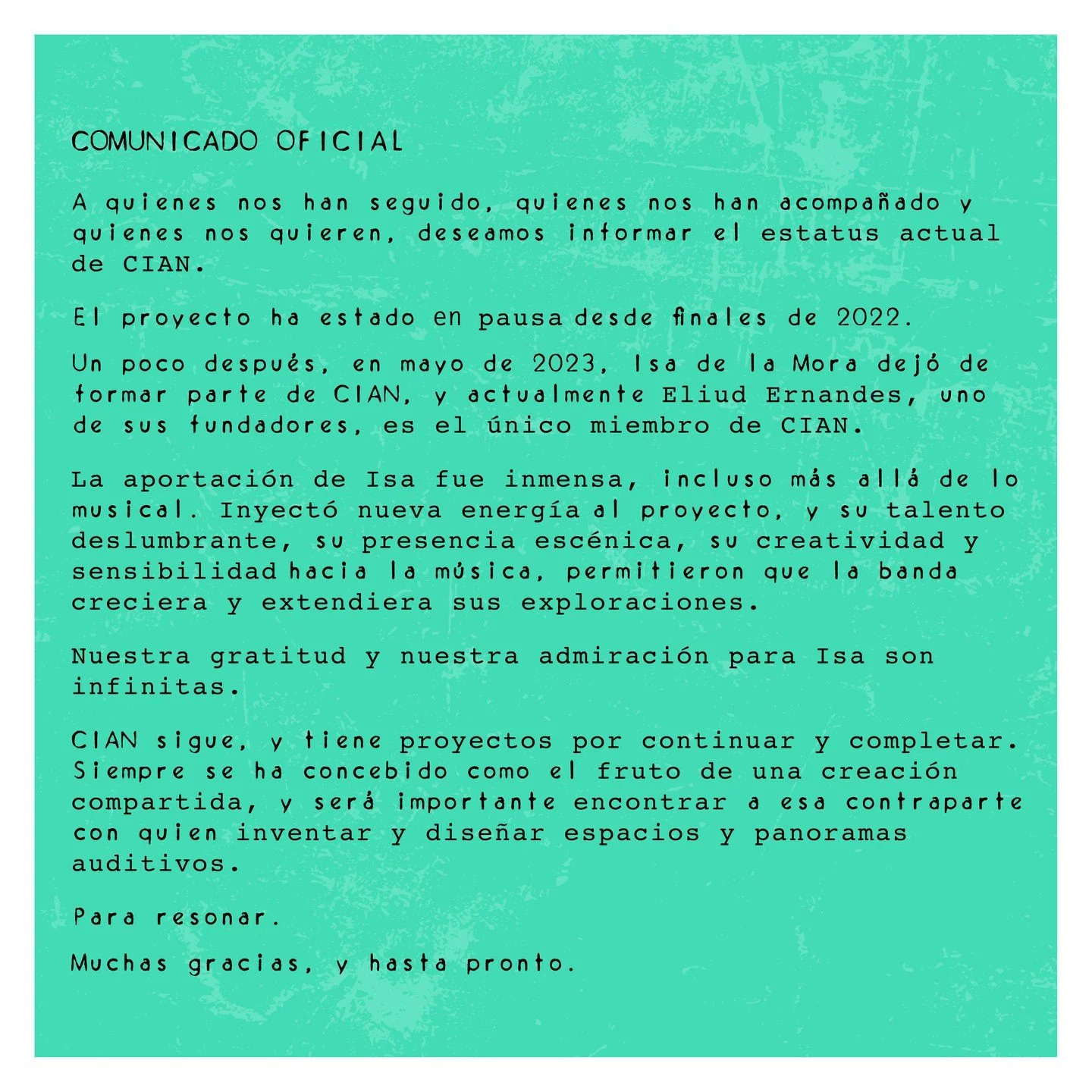 "CIAN es una de esas bandas a las que disfrutas escuchar. El balance perfecto de su música, la interesante construcción de sus temas, el gran trabajo vocal y desarrollo de loops de este dúo, los constituye en algo único.".